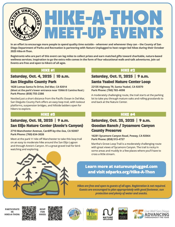 - Hike-A-Thon Group Led Hikes – Starting October 4th, 9am at San Dieguito County Park